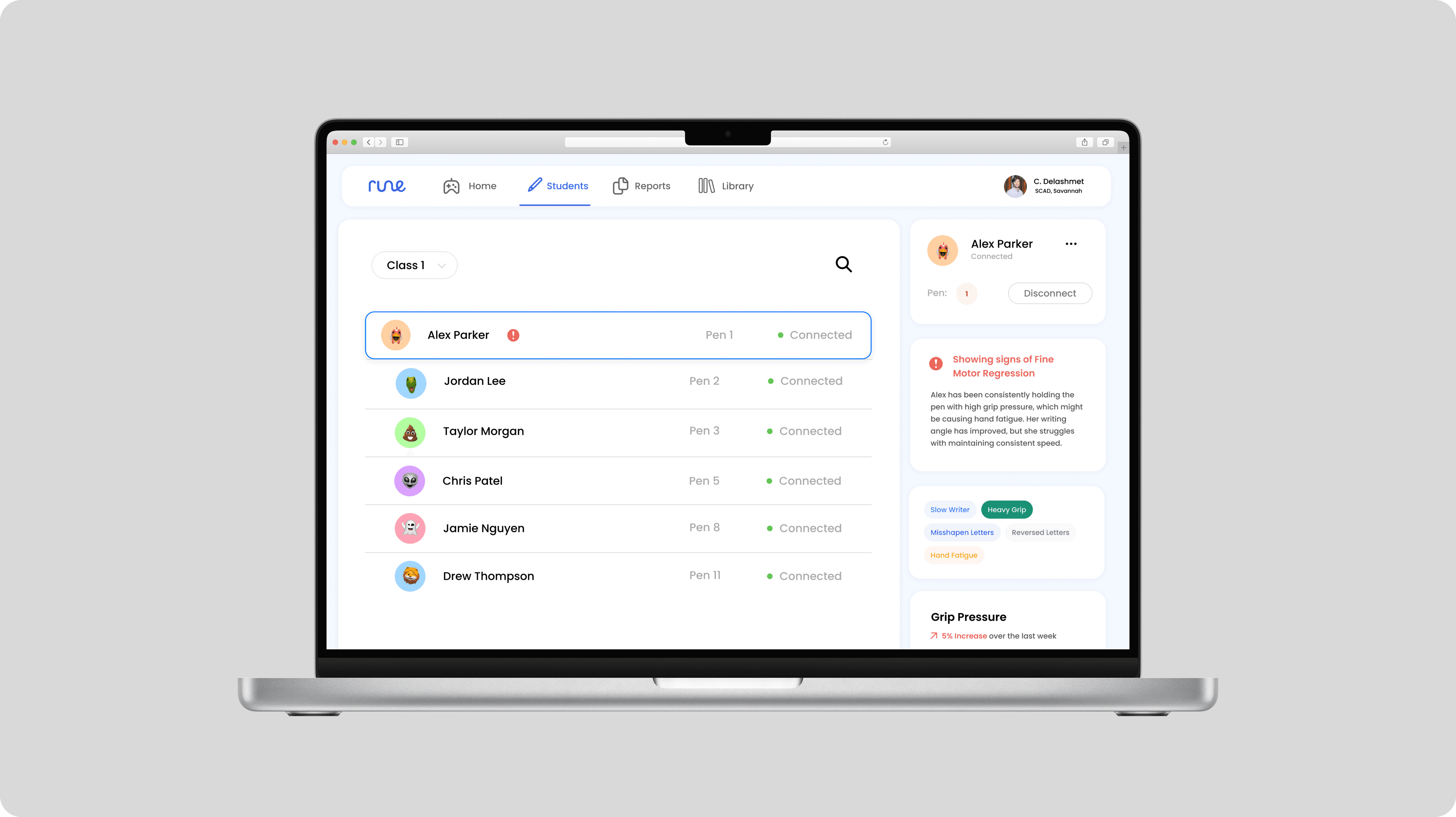 Rune integrates a smart pen with an intuitive user interface to provide real-time insights into student writing. By combining advanced data tracking with a user-friendly design, Rune allows educators to identify and address student challenges with precision. This solution fosters student confidence, streamlines assessment, and promotes academic success through actionable feedback and engagement tools.